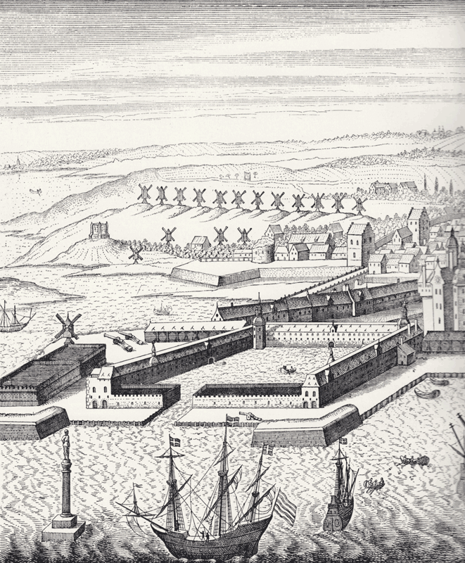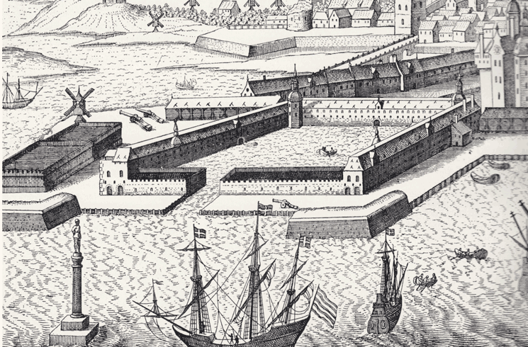 Christian 4. opførte omkring 1600 et tøjhus i København. Det ses på tegningen som den lange bygning til venstre. Overfor lå provianthuset, og imellem dem var udgravet et havnebassin. Her kunne orlogsskibene gå ind, når de skulle udrustes. Ideen var imidlertid 50 år gammel …