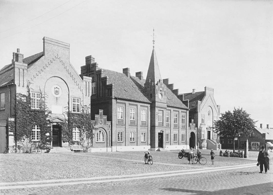 Ældre foto af Skanderborg Rådhus på Torvet. (© Stenders postkortsamling)