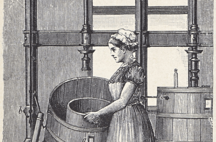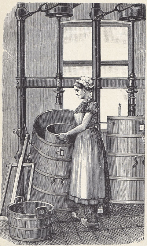 Tegning af kvinde ved kærnestativ med to kærner, før 1890.