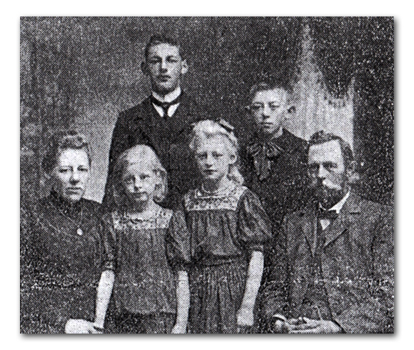 Foto omkring 1907, Møllerfamilien på Vester Mølle, Chr. F. Løvschall og fru Marie samt børnene Oscar, Aage, Ellen og Grethe. (© Skanderborg Amts Avis 14/2 1953)