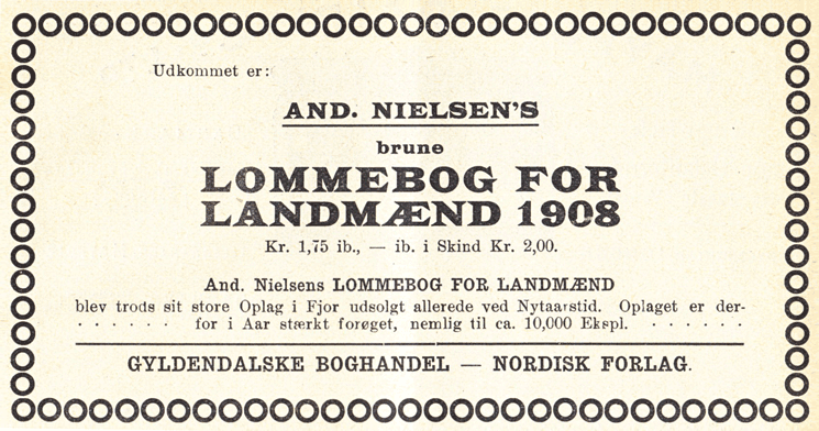 „Jeg er Udgiver af: And. Nielsens „Lommebog for Landmænd“ (ca.11000 Exempl) nu paa 10nde Aargang og tjener noget paa den“, fortalte Anders Nielsen i 1907. For Anders var lommebogen på samme tid et stykke oplysningsarbejde og en forretning …