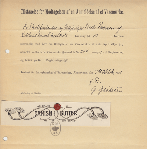 Kvittering for anmeldelsen af Lurmærket som varemærke den 7/10 1901.