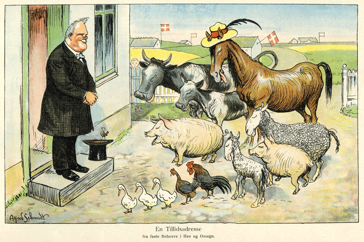 Tegning af Alfred Schmidt i Blæksprutten 1909: I. C. Christensen var konseilspræsident, da Anders Nielsen blev valgt til Folketinget, men oprindeligt skolelærer i Hee i Vestjylland.