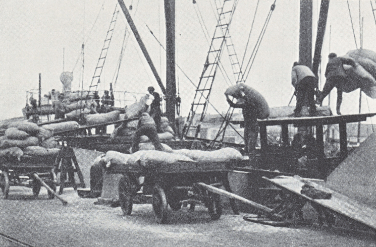 Sådan lossedes der i gamle dage. Nye forsyninger af foderstoffer til JAF.