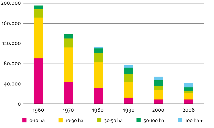 Diagram, der viser faldet i antallet af landbrugsbedrifter fra 1960 til 2008. (Danmarks Statistik)