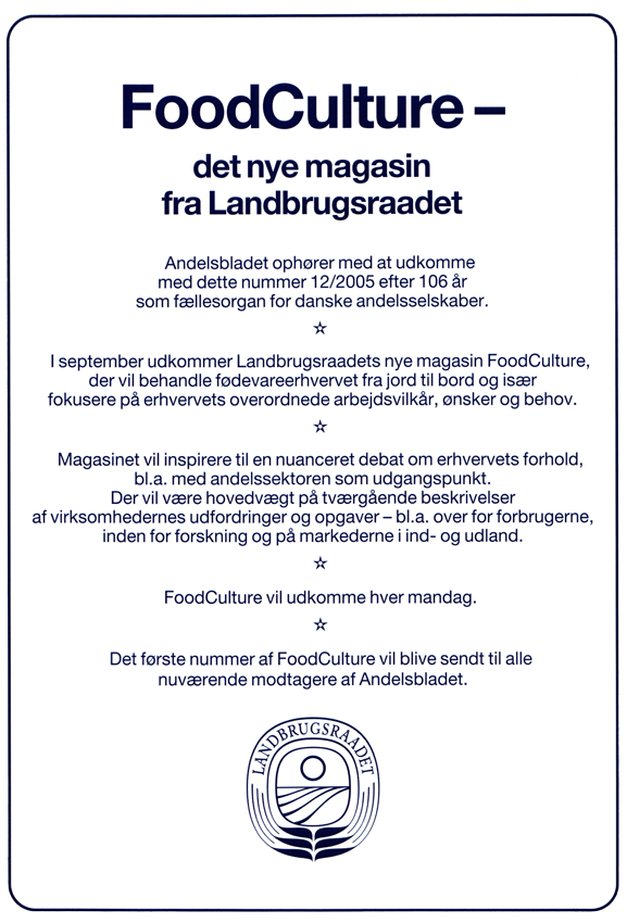 Meddelelse i det sidste nummer af Andelsbladet juni 2005