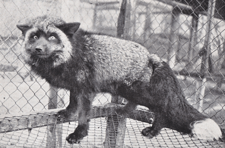 Foto omkring 1940 af „Smukt Eksemplar af en Sølvræv“, den tids foretrukne pelsdyr. (Kilde: Alf Lund: Pelsdyravl i Danmark.